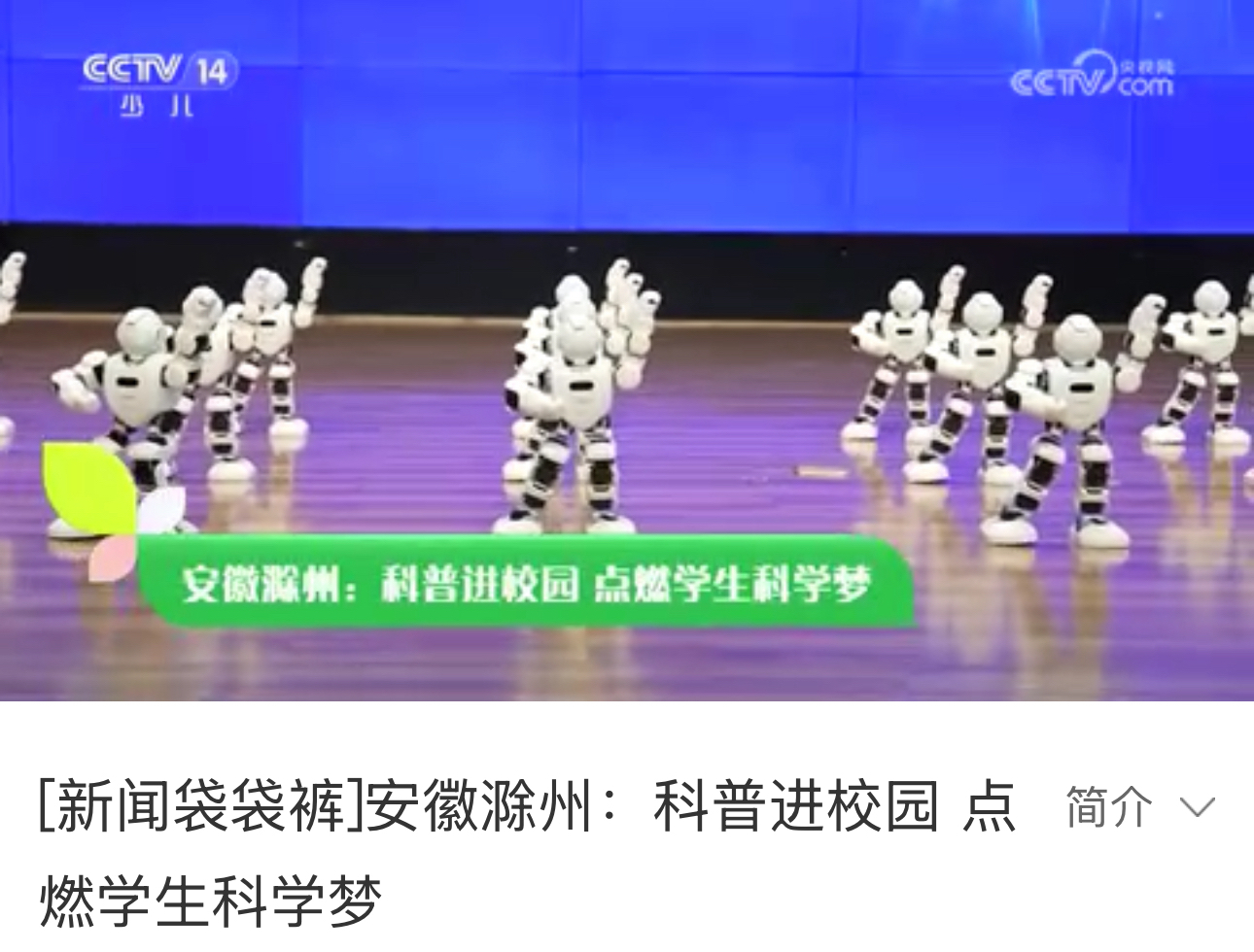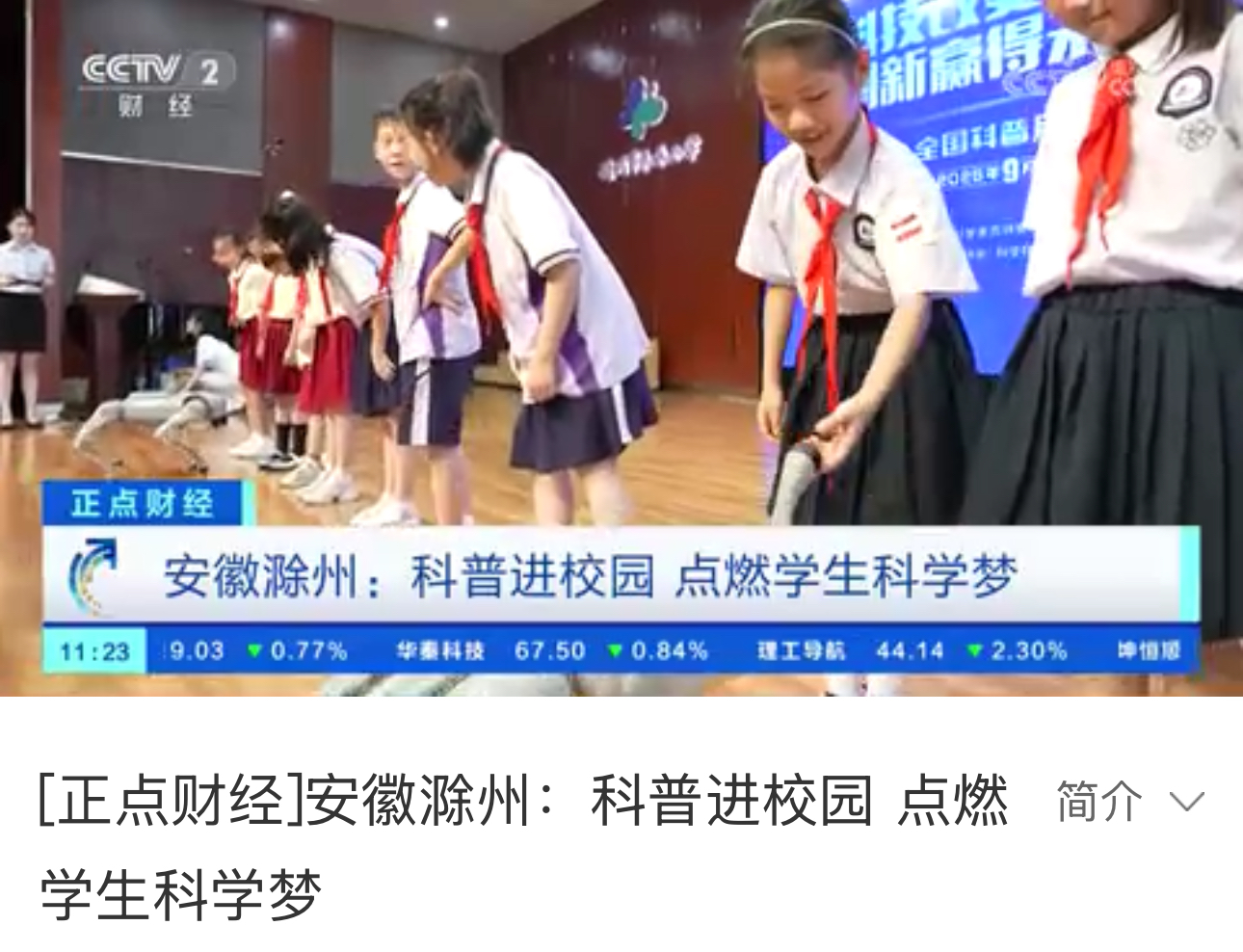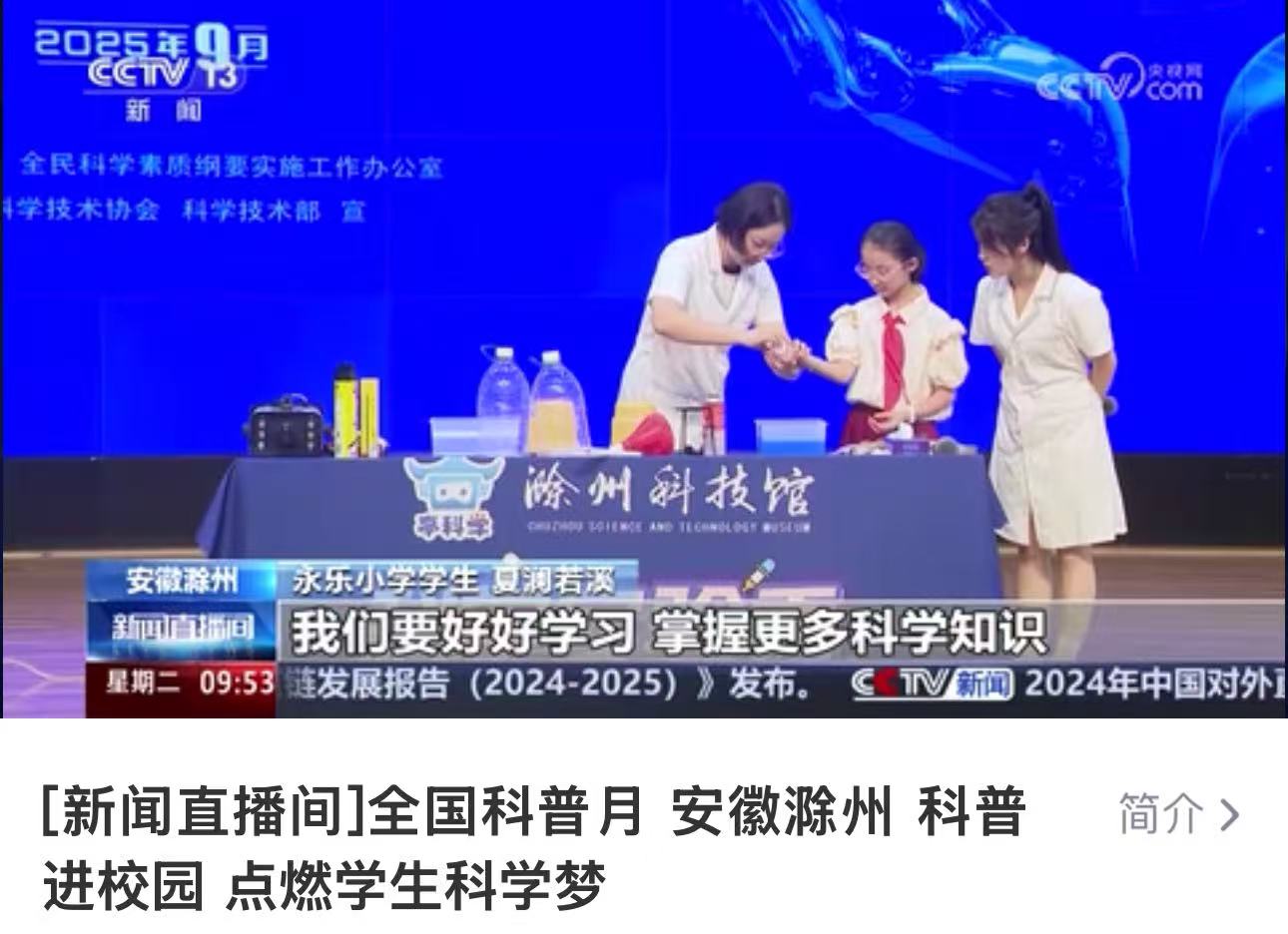 央视新闻频道《新闻直播间》、财经频道《正点财经》、少儿频道《新闻袋袋裤》分别以“安徽滁州:科普进校园 点燃学生科学梦”为题,对全国科普月期间市科技馆赴永乐小学开展跳舞机器人、机器狗动作表演、科学实验秀等形式多样、内容丰富的科普活动进行了详细报道。活动兼具科学性和趣味性,通过互动体验的方式,为全校师生提供了一场形式多样、内容丰富的科学盛会,激发了学生们对科学探索的浓厚热情。