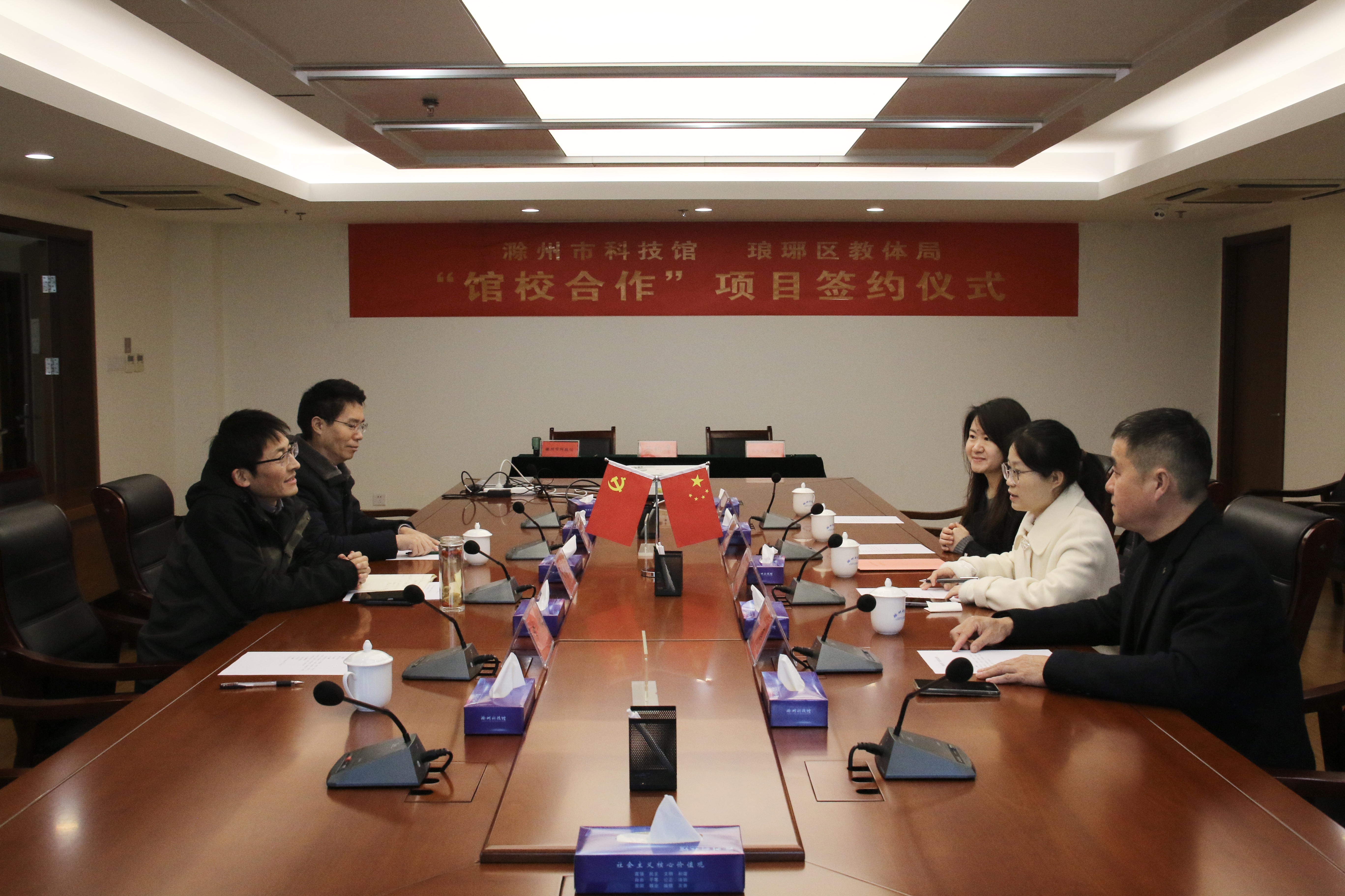 琅琊区教体局一行4人实地参观了常设展厅、“中国古代科技展”、“科学家精神”主题展、创客教室等区域。座谈上,双方在“科普研学与实践”、“课程开发与教学”、“科普进校园”、“师资队伍建设”、“科学教育平台与体系建设”5个方面内容进行深入交流探讨,就馆校资源共享、协同育人达成共识。最后,双方共同签署《“馆校合作”项目协议书》。